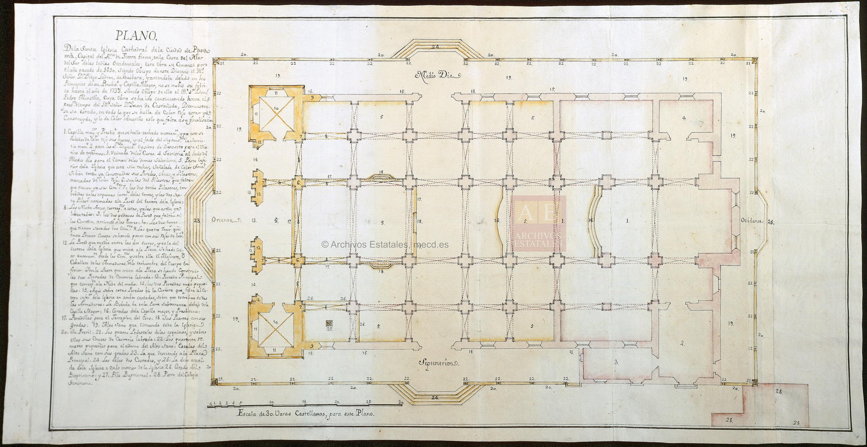 図 1. Catedral de Panamá, plano de 1749 por Nicolás Rodríguez. “Plano de la Santa Iglesia Cathedral de la Ciudad de Panamá, Capital del Reino de Tierra Firme …: Demuéstrase su estado, en todo lo que se halla de color rojo estar ya construydo, y lo de color amarillo es lo que falta á su finalisación.” (AGI).