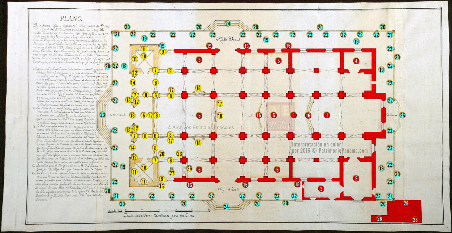 Plano. De la Santa Iglesia Catedral de la Ciudad de Panamá, Capital del Reino de Tierra Firme, en la Costa del Mar del Sur de las Indias Occidentales: Esta obra se comenzó por el año pasado de 1690. Siendo Obispo de esta Diócesis el Ilustrísimo Señor Don Diego Ladrón de Guevara, y habiéndola dejado en los principios de su Presbiterio y Capilla Mayor, no se movió su fábrica hasta el año de 1733. Siendo Obispo de ella el Ilustrísimo Señor Don Pedro Morsillo, cuya obra se ha ido continuando hasta el presente tiempo del Ilustrísimo Señor Don Juan de Castañeda, Demuéstrase su estado, en todo lo que se halla de color rojo estar ya construido, y lo de color amarillo es lo que falta a su finalización.