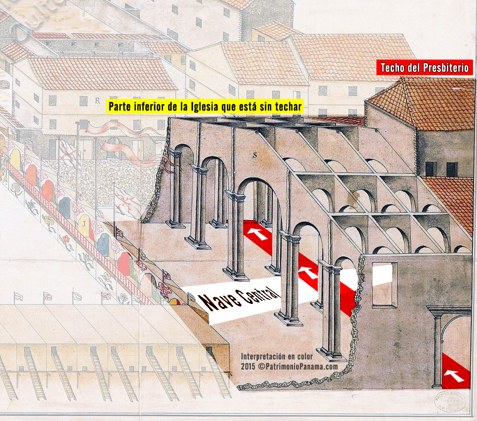 Figura 4. Detalle de «La plaza mayor de Panamá adornada para celebrar toros, comedias y máscaras en honor de Fernando VI en febrero de 1748.» (AGI). Modificaciones en color por la Autora.